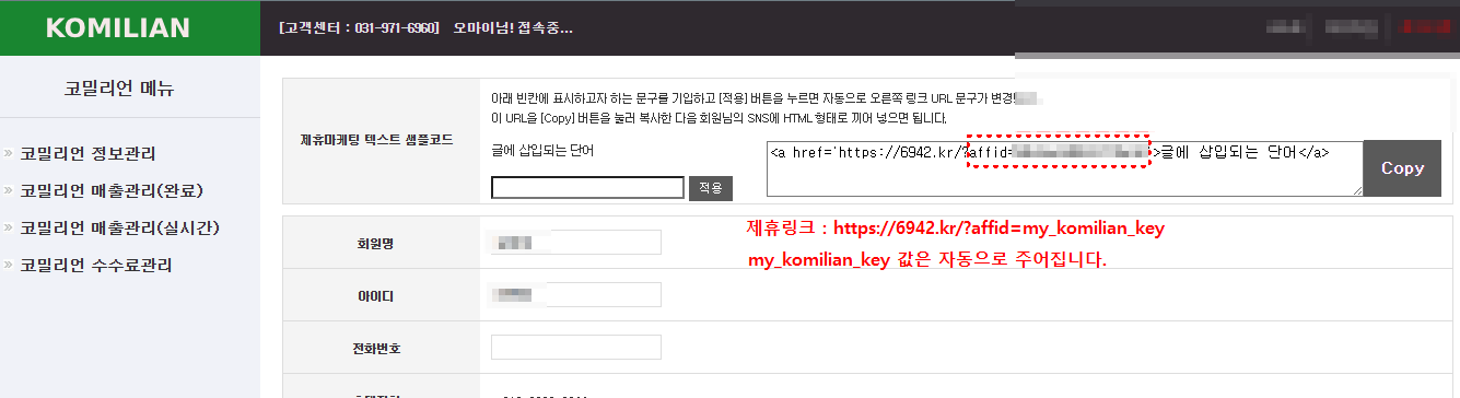 관리자 페이지로 이동하면 아래 화면이 나타납니다. 여기서 'affid=' 다음에 나오는 문자가 '제휴사 키값'입니다.